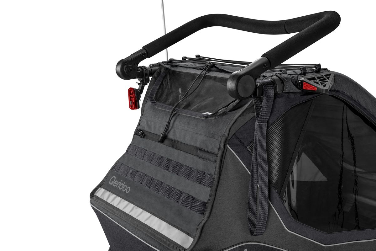 - Achte stets darauf, dass das Sicherungsband befestigt ist, bevor Du den Qeridoo im Trailer-Modus verwendest. Zusätzlich ist darauf zu achten, dass es nicht in bewegliche Teile des Zugfahrrads gelangen kann.