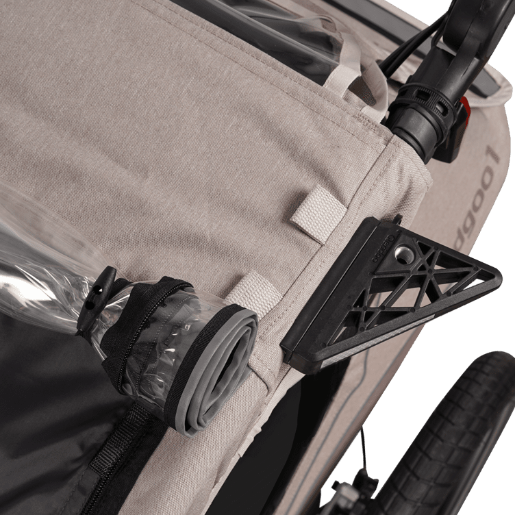- Schließe den inneren Teil des 3-in-1-Verdecks, um die Kinder mit dem eingearbeiteten Insektenschutznetz vor Insekten und kleineren Steinchen zu schützen. Zum Schutz vor Abgasen sollte im Straßenverkehr zusätzlich die Fensterfolie geschlossen sein.