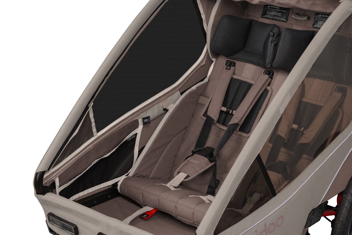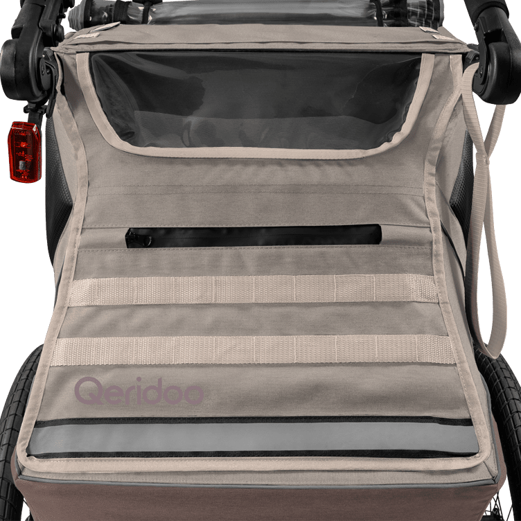 - Lasse die Kinder im Qeridoo niemals unbeaufsichtigt und achte darauf, dass sie sich wohlfühlen. Lege bei längeren Fahrten regelmäßig Pausen ein, in denen sich die Kinder bewegen können. Sorge für eine ausreichende Flüssigkeitsaufnahme.