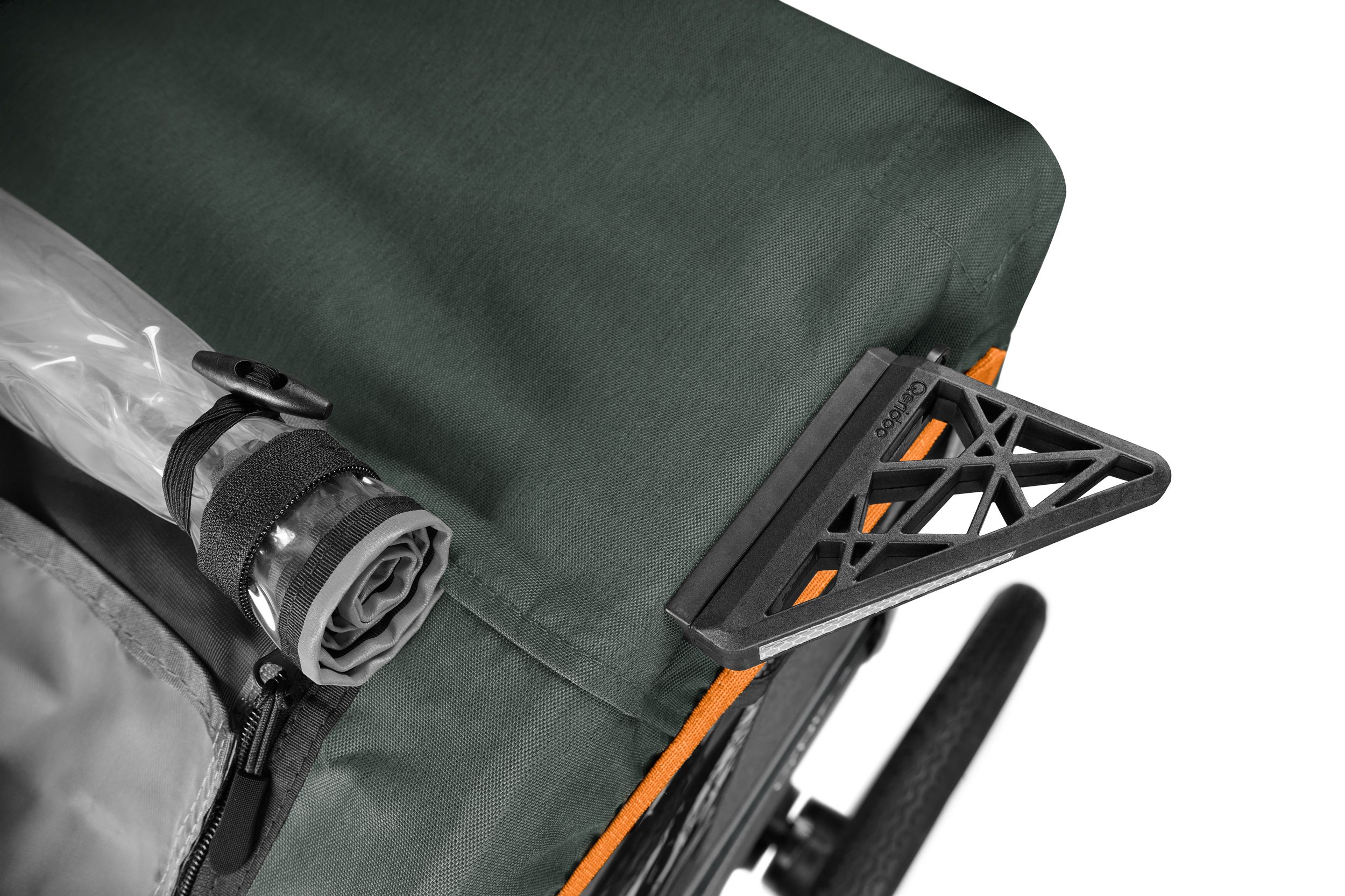 Rundum sichtbar: Reflektoren vorne, hinten, an den Rädern und im Stoffdesign – plus Sicherheitswimpel und Rücklicht