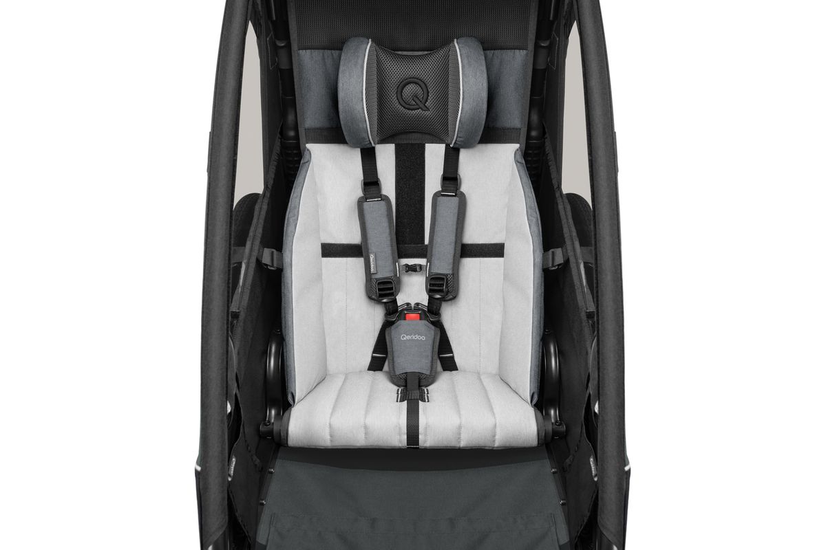 Das Komfort-Sitzsystem mit eingewebten Rückenprotektoren, gepolsterten Seitenwänden und dem 5-Punkt-Gurt sorgt für eine angenehme und sichere Sitzposition für Dein Kind und erleichtert Dir gleichzeitig die Handhabung. Die höhenverstellbare Kopfstütze lässt sich dank Klett mühelos auf die passende Position anpassen.