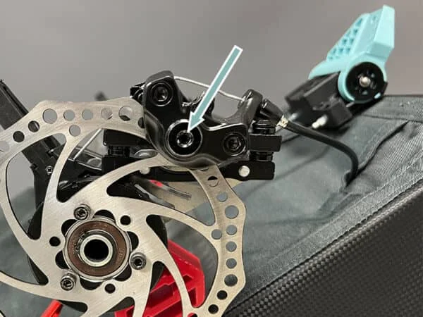 • Löse die beiden Schrauben am Bremssattel mithilfe eines Innensechskantschlüssels der Größe 5. Der Bremssattel lässt sich jetzt seitlich in der Position verschieben.