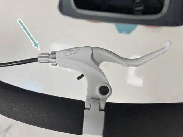 Drehe die Rändelschraube am Bremshebel heraus, um die Bremskraft zu erhöhen. Achte dabei darauf, dass die seitlichen Einschnitte zum Einlegen des Bremszugs nach dem Justieren nicht in einer Linie stehen.